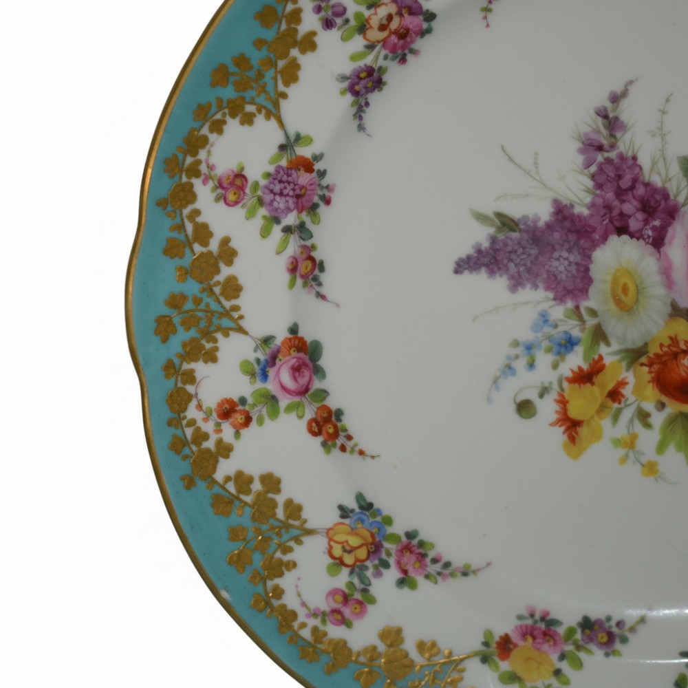 For offer is a stunning Nantgarw Cabinet Porcelain Plate. Circa 1818-20. The plate was probably decorated in the Sims workshop in London. It is beautifully decorated with a central flower spray, including ox eye daisy, with further flowers in coloured enamels and tooled gilt at the turquoise border. It has a gilt shaped rim. Impressed 'NANT-GARW CW' mark Diameter: 23.8 cms The provenance is from a private collection London. In first class condition with beautifully vivid colouring and with minimal gilt wear. One tiny 2 millimetre chip on the turquoise border, as shown in the photograph, from being displayed that is hardly discernible but mentioned for accuracy. Ref: 2422 The prices include delivery to a UK address. International deliveries are welcome, please contact for international postage costs. Internal Ref: 2422