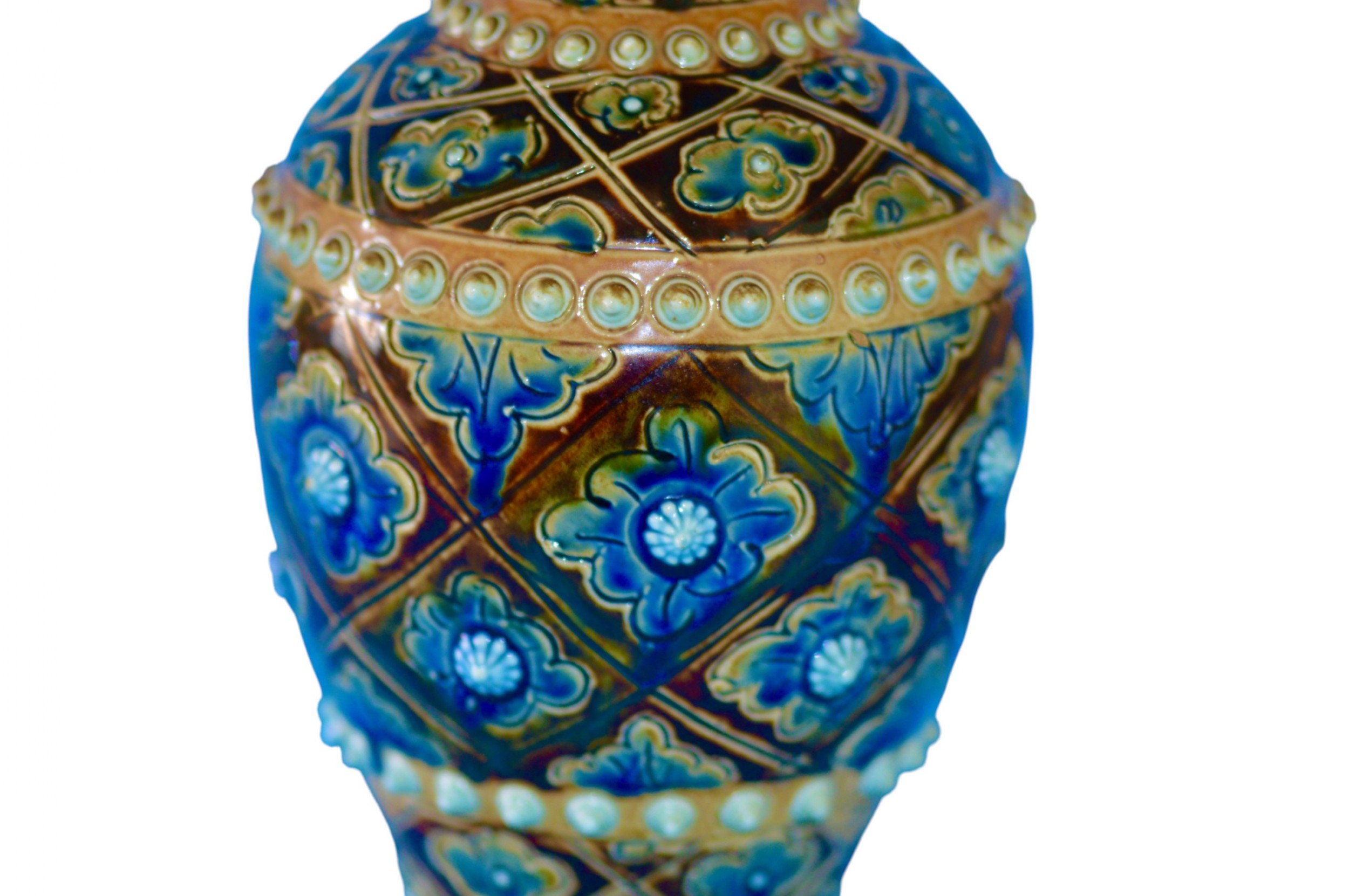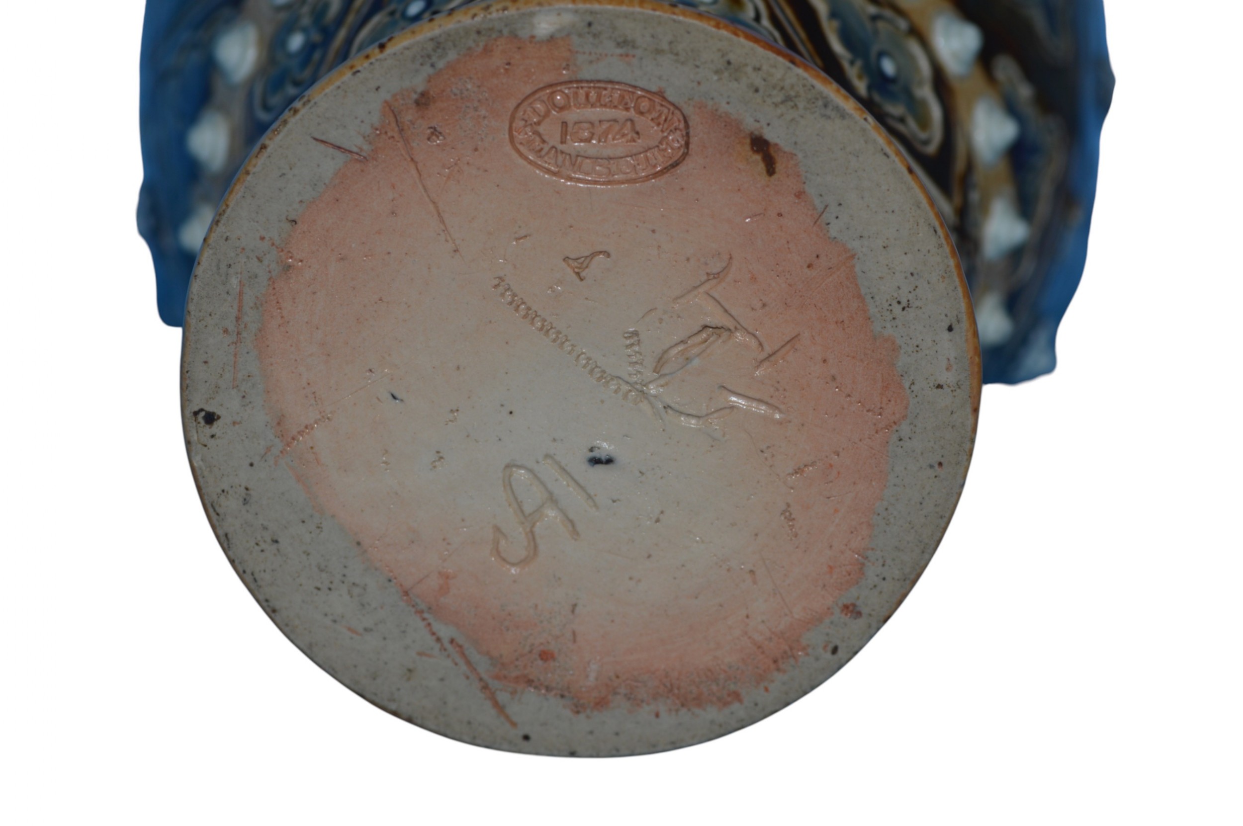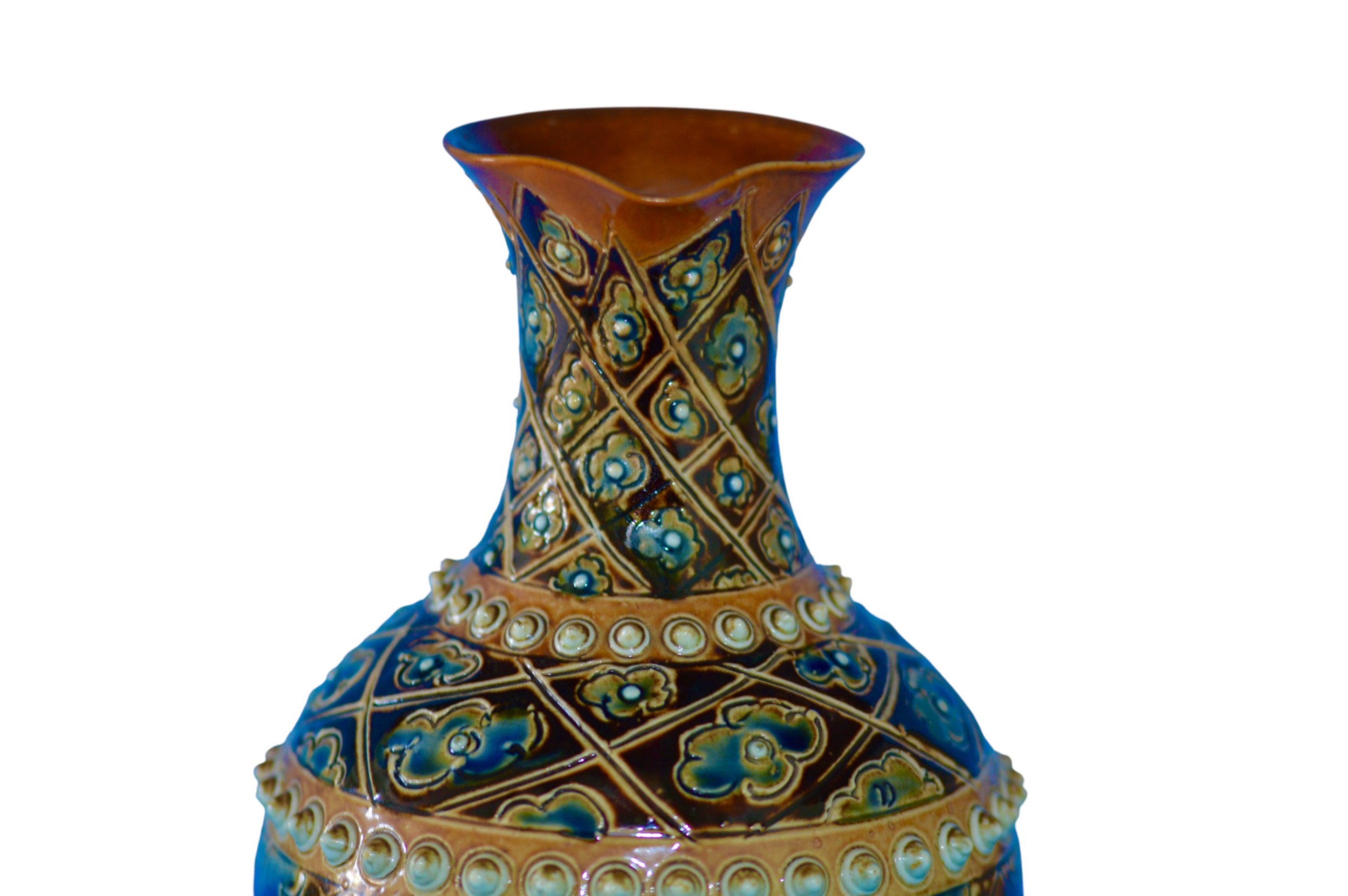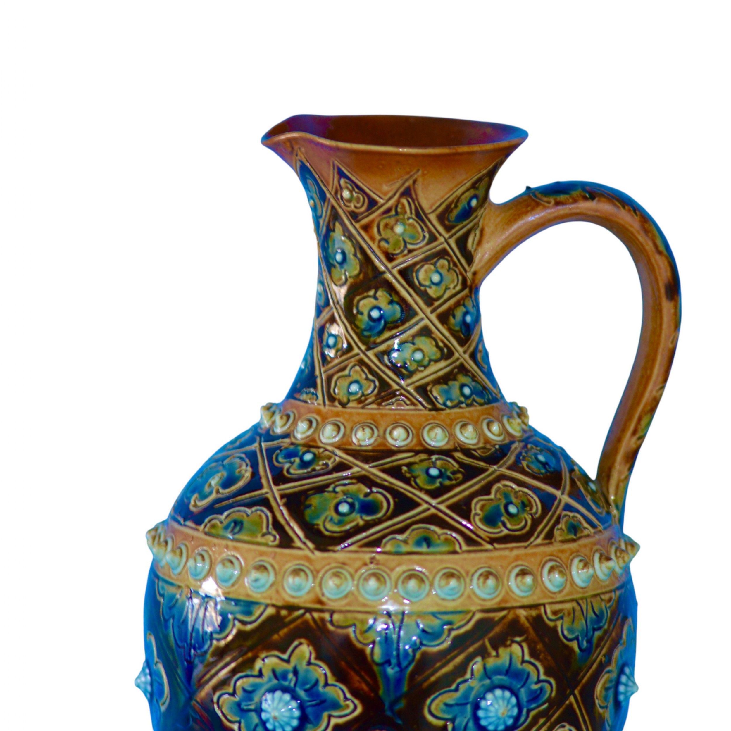 For offer is an exceptional, very early, Doulton Lambeth jug by arguably their most famous artist, George Tinworth. George Tinworth studied at the Lambeth School of Art under John Sparkes and at the Royal Academy. In 1866, he was among the first students employed by Henry Doulton to work for Doulton's Lambeth factory. The jug is dated 1874 The background of the jug is brown and it is delightfully decorated with blue florets within diamond shapes and enhanced by decorative pinnacles. The jug is stamped on the base with the early Doulton Lambeth mark and dated 1874 together with the George Tinworth mark clearly engraved together with that of an assistant. This is a top quality and delightful example from one of Doulton Lambeth's prime artists. The prices include delivery to a UK address. International deliveries are welcome, please contact for international postage costs. Internal Ref: 2418