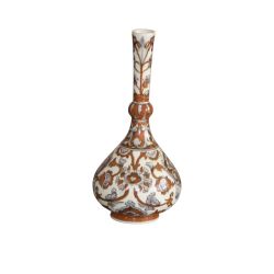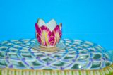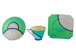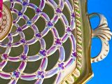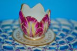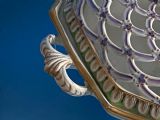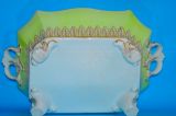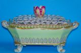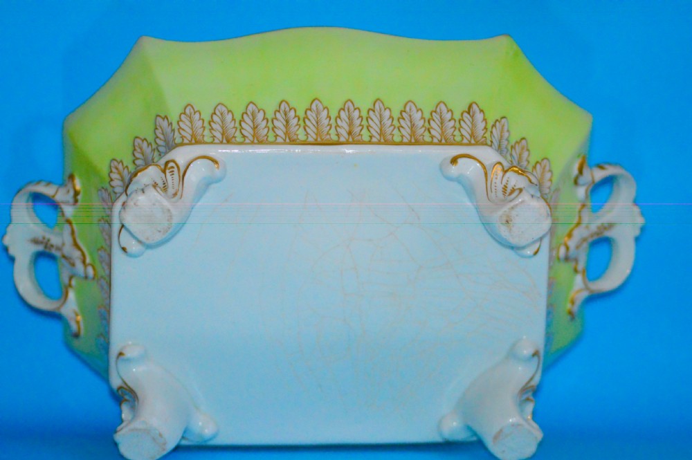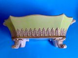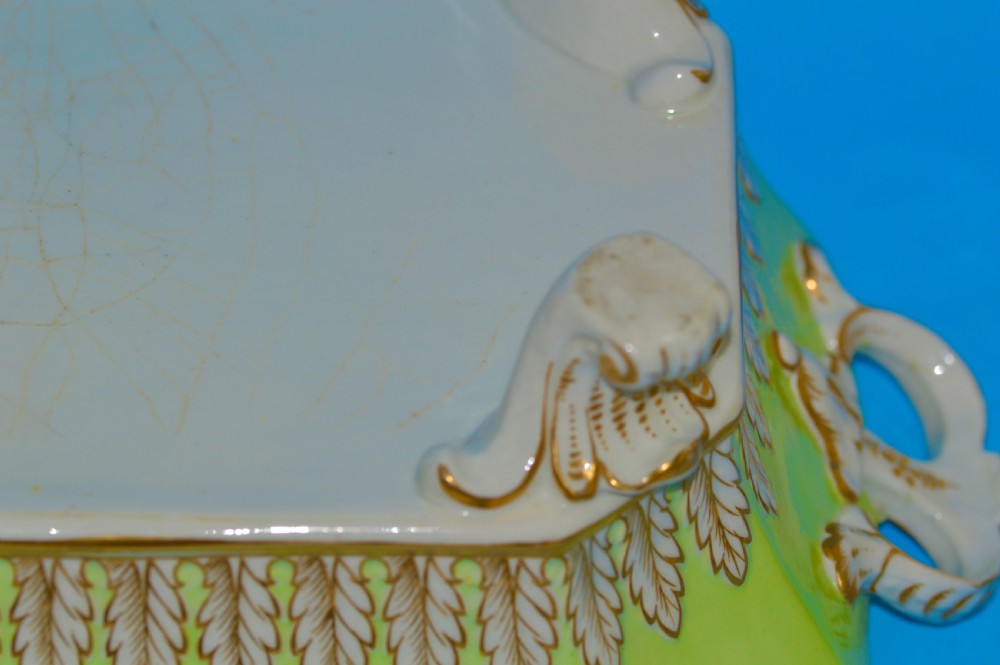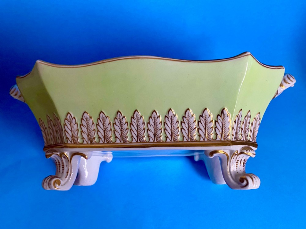 Beautifully decorated in light green ground with acanthus leaf moulding and a tulip finial.