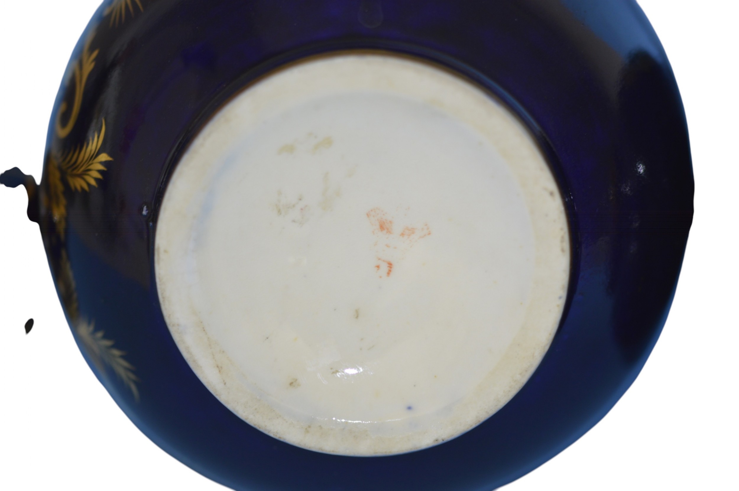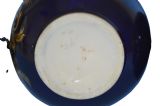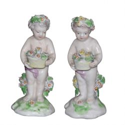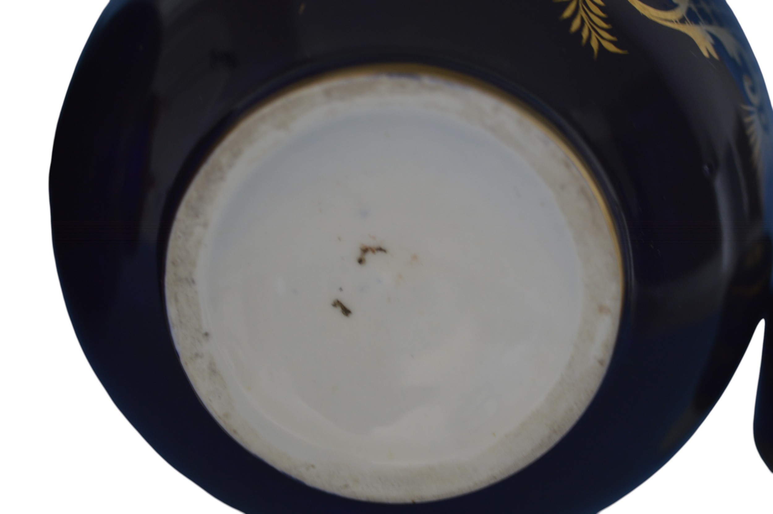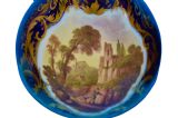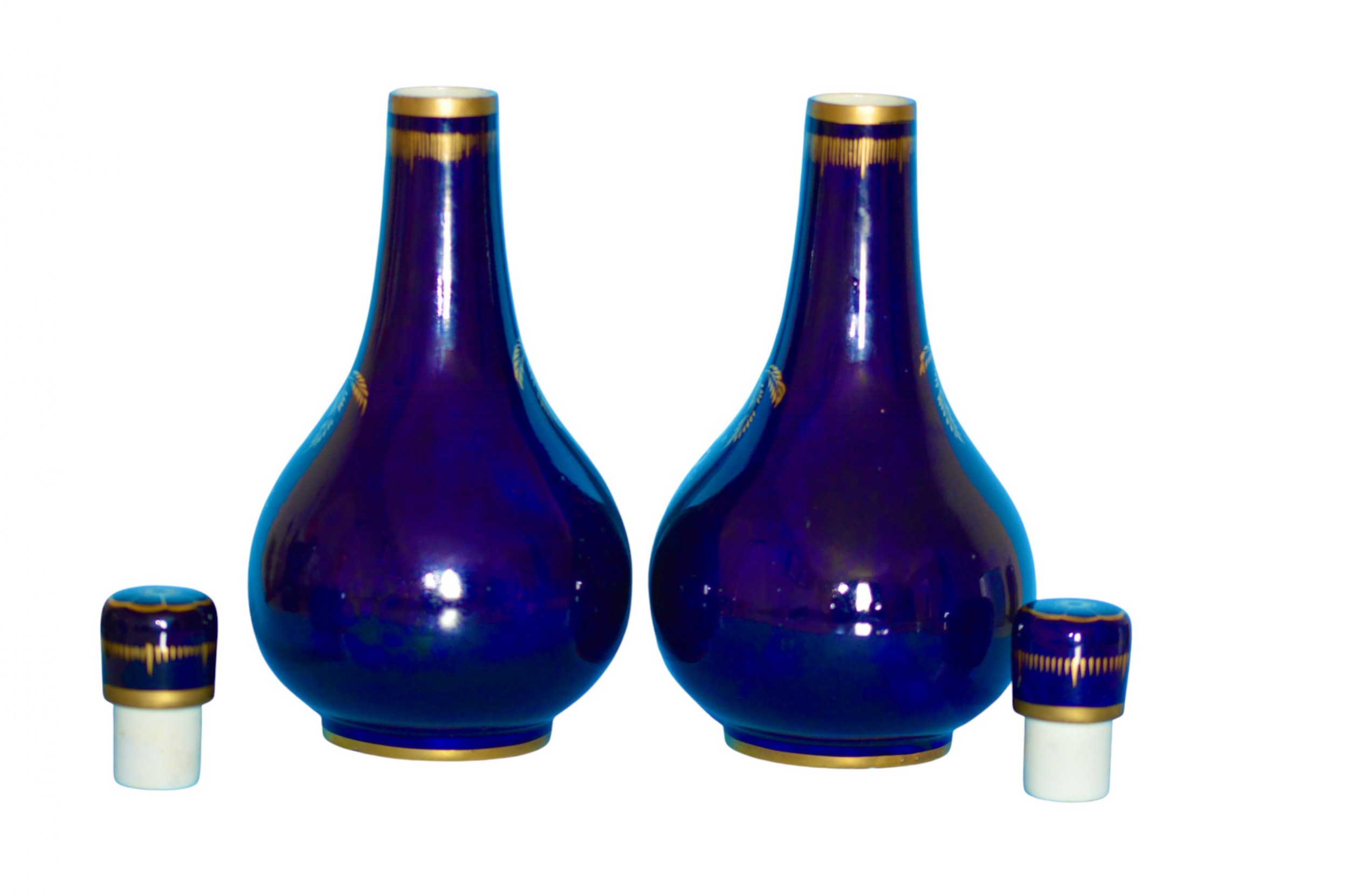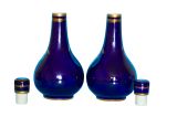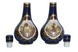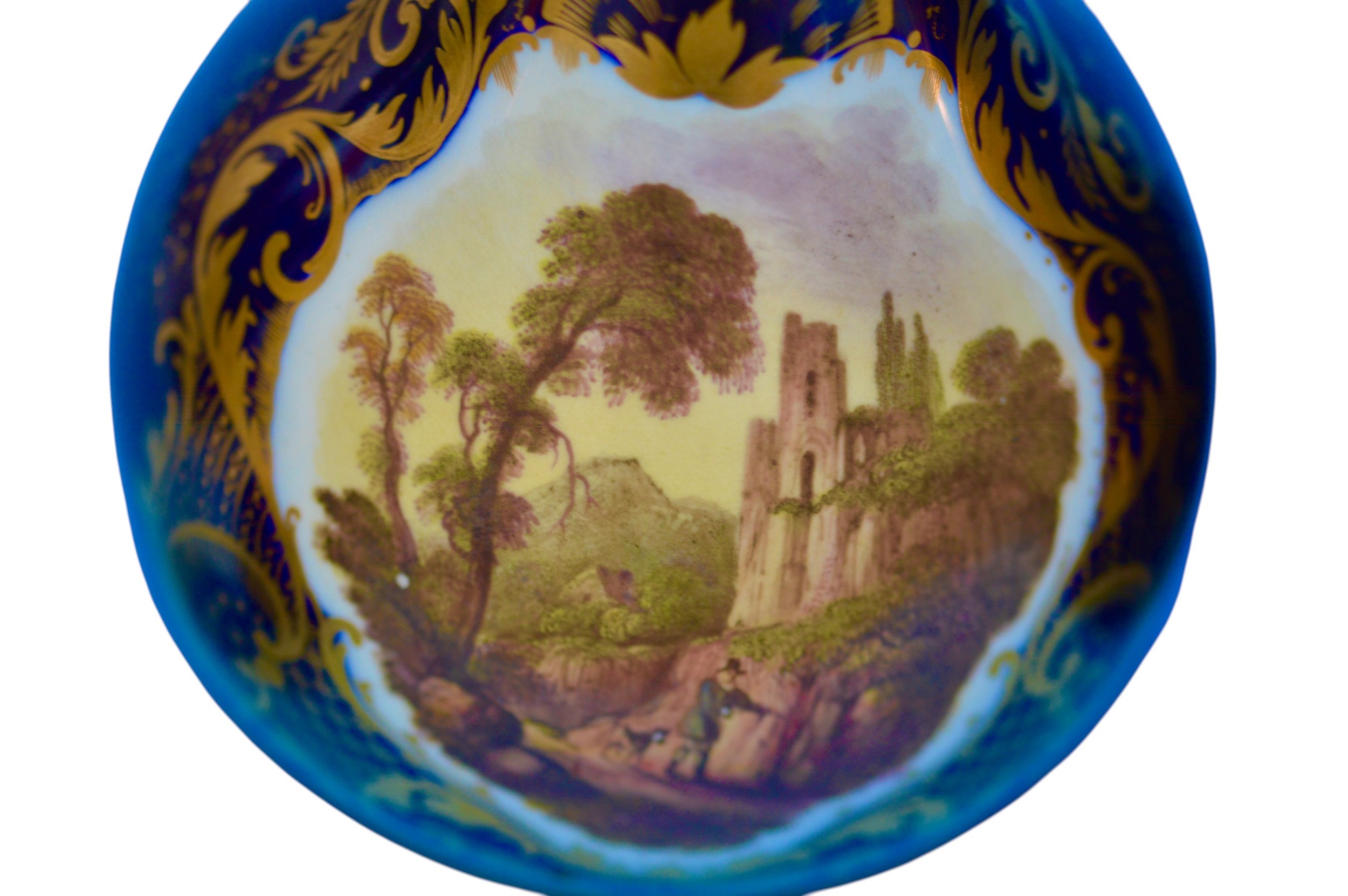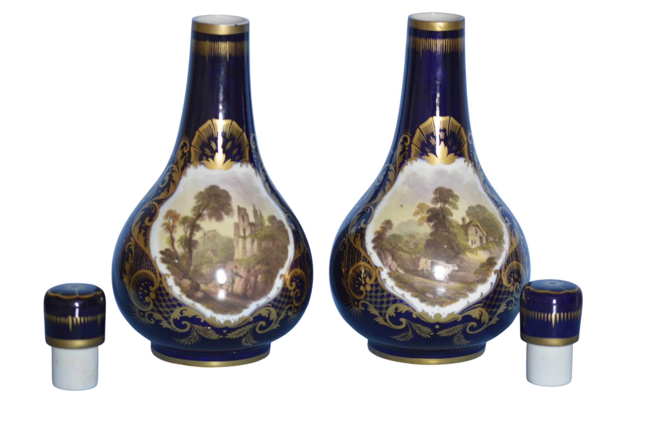 Pair of Derby porcelain blue-ground bottle-vases and covers. c1830 Traces of red crowned D mark to one vase. Each vase is painted with figures in wooded landscapes, one with a thatched cottage and livestock, the other with a gothic ruin, within gilt cartouches with foliage, shells and diaper ornament. Both vases are in very good condition with no cracks and with one vase having a 0.3 centimetre loss of gilt on the top of the neck and with some rubbing of the gilt. There are also a few tiny pit marks and some minor loss of the blue from usage that certainly does not impact on how they display as shown in the photographs. They are a delight. The prices include delivery to a UK address. International deliveries are welcome, please contact for international postage costs. Internal Ref: 2377