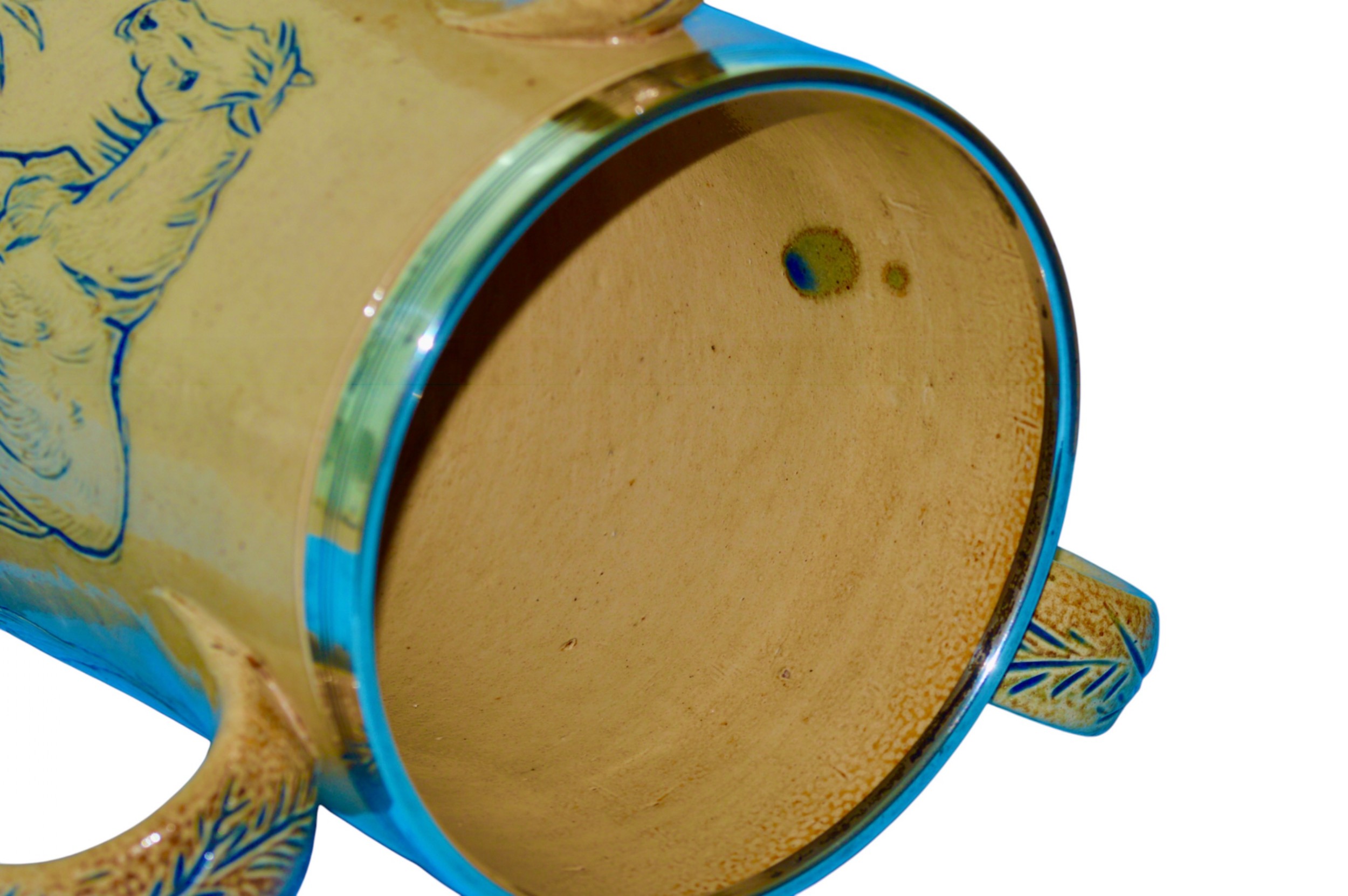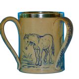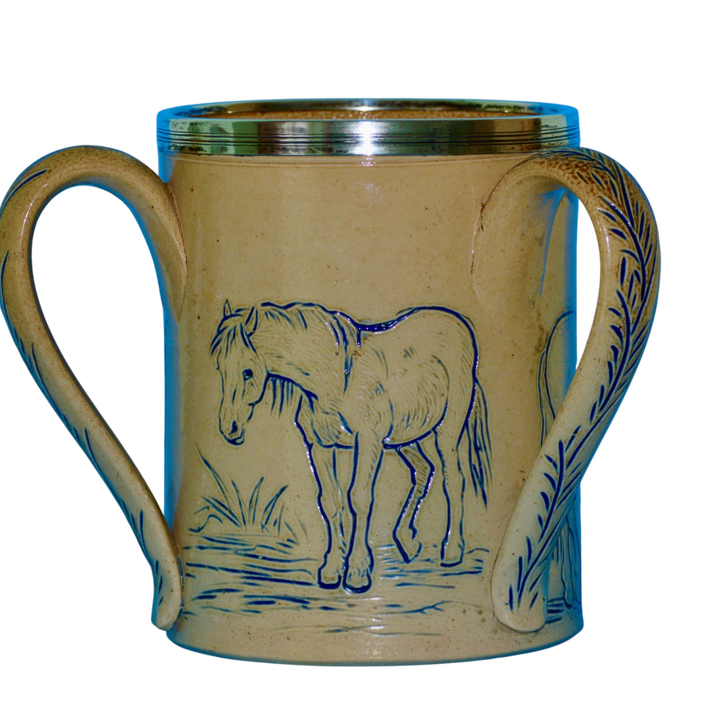 For offer is this outstanding, substantial, and rare, early Hannah Barlow horses Tyg. The delightfully simple design is of three horses in blue sgraffito with foliate handles. The silver rim is marked as London 1872.