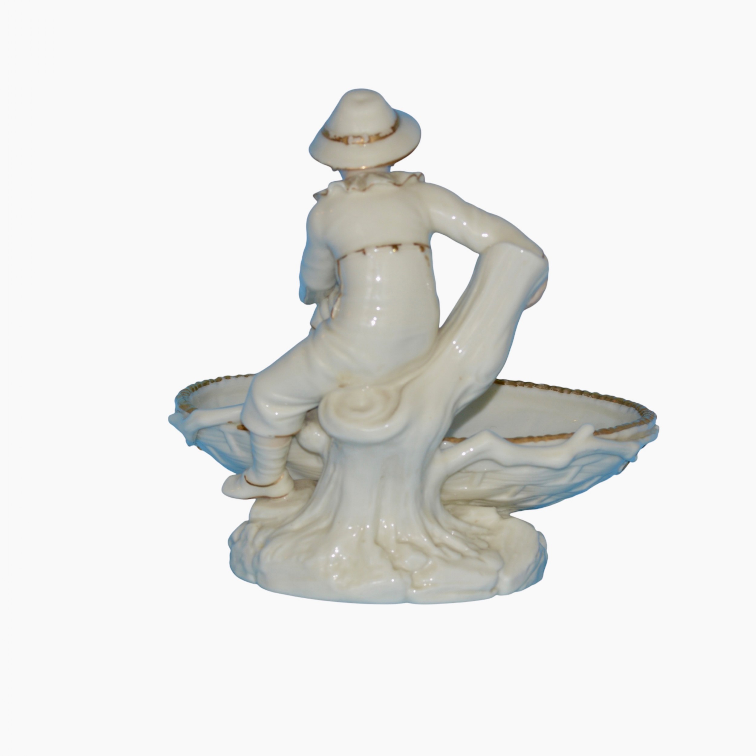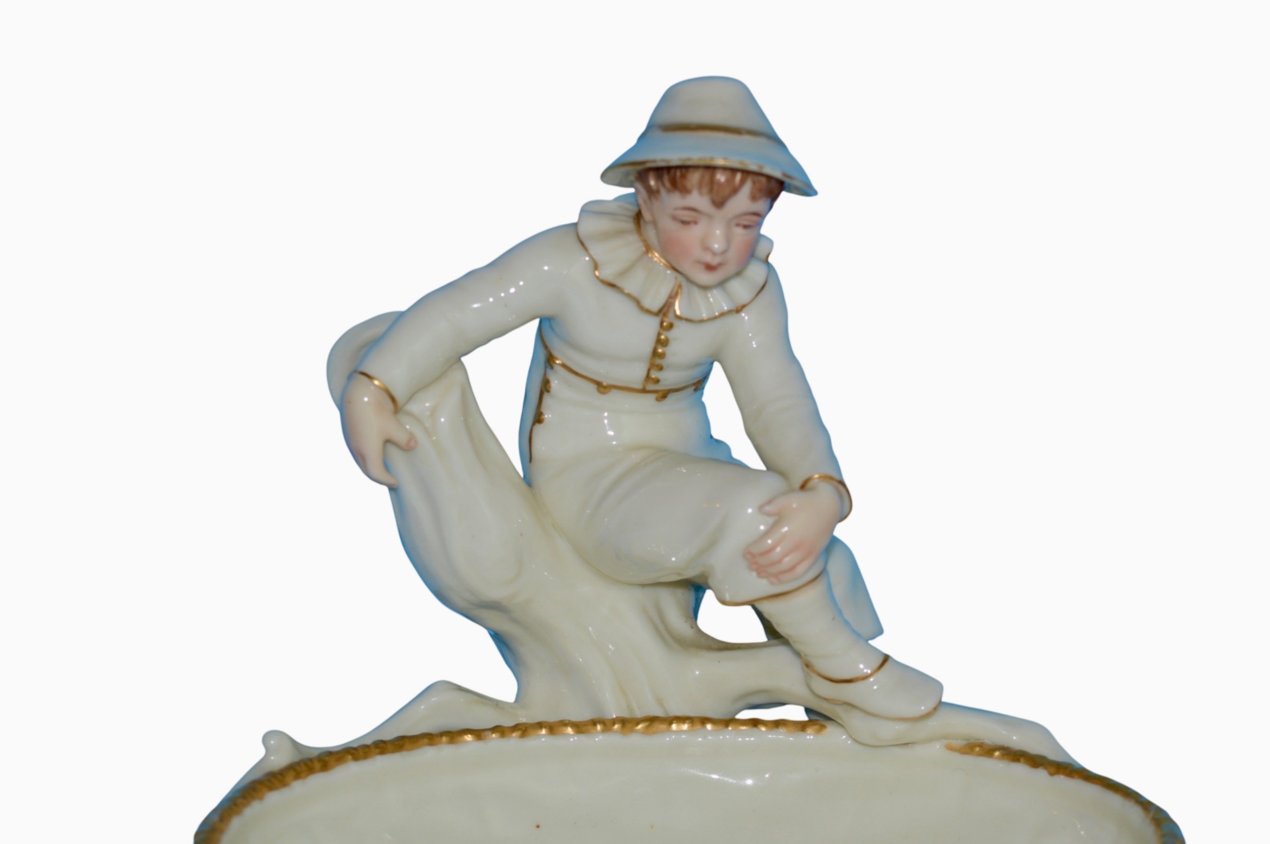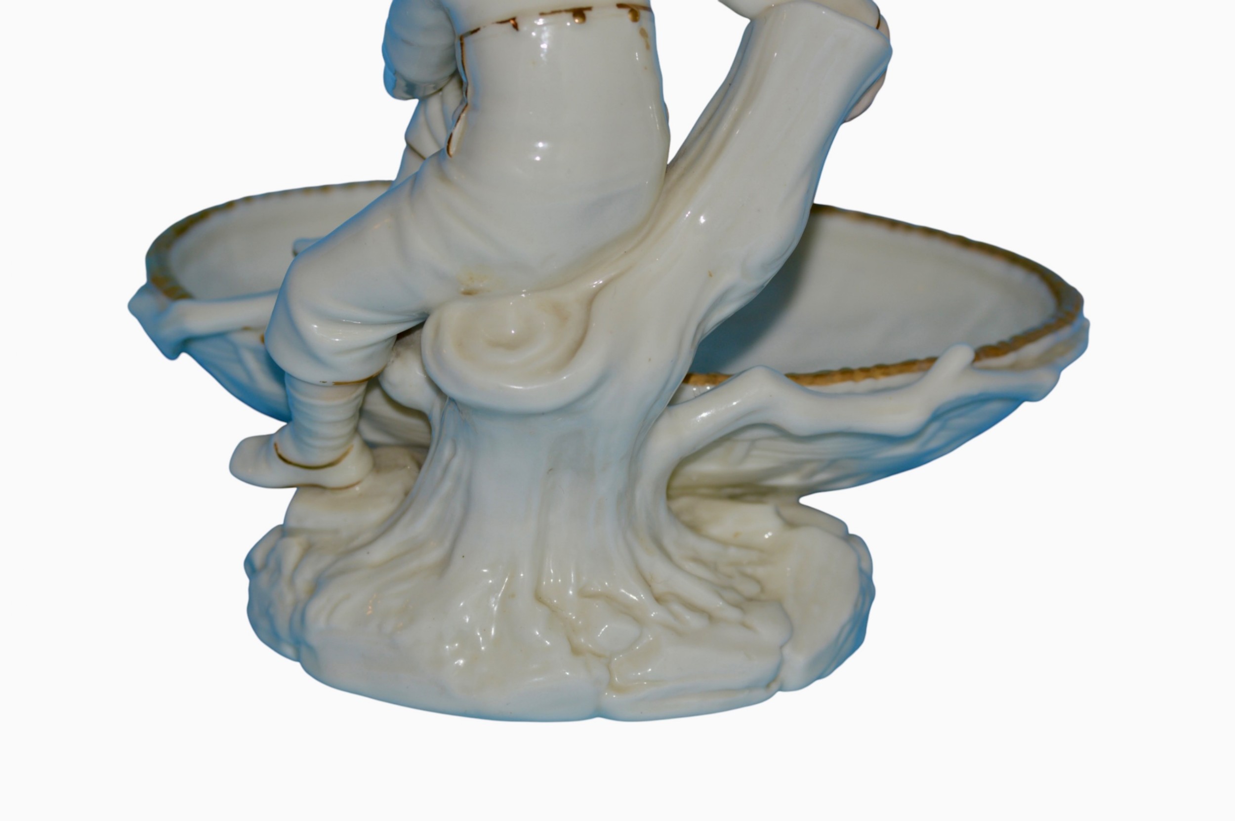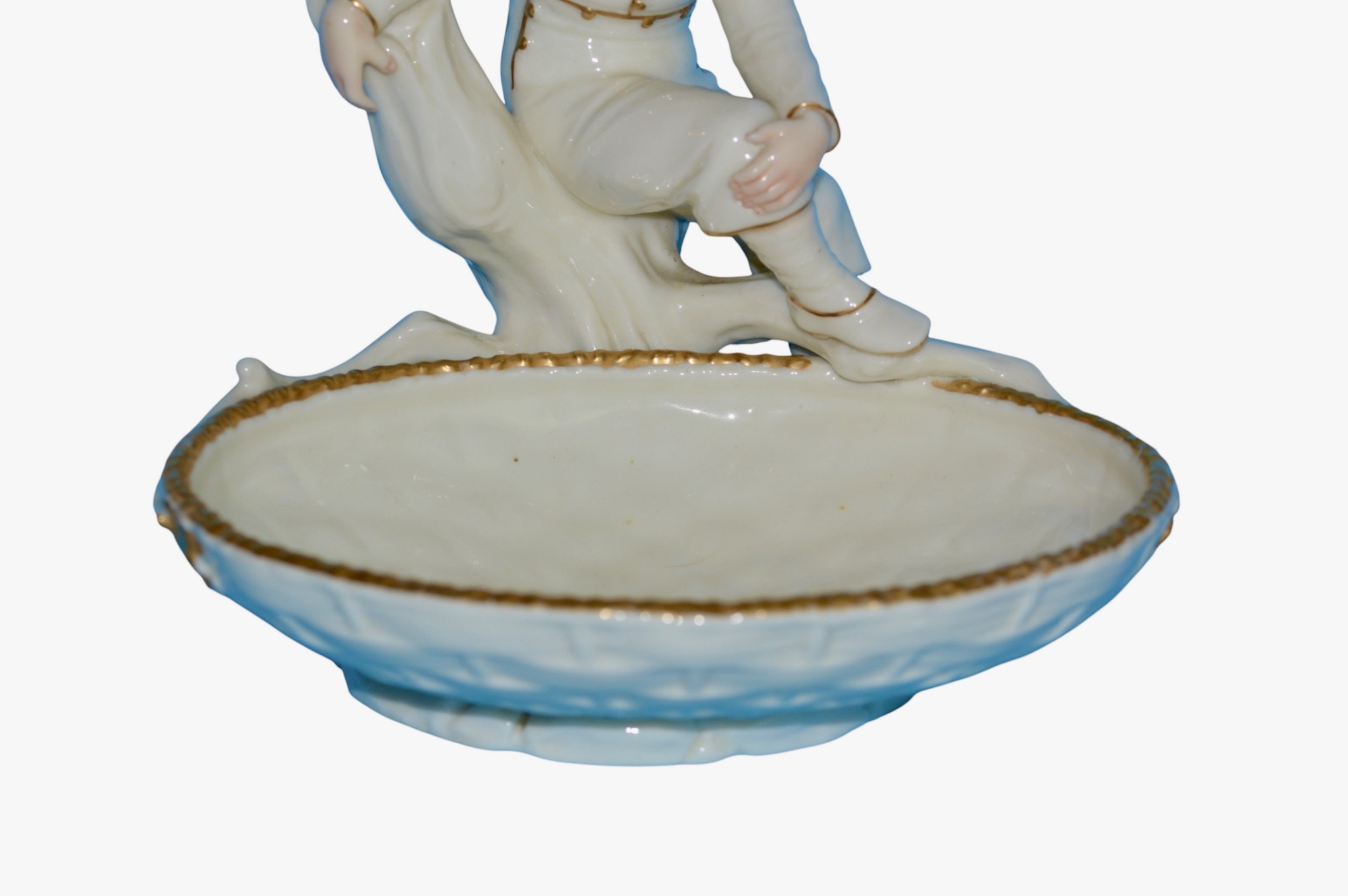 A delightfully modelled Royal Worcester Hadley style Figural Porcelain Comport The comport depicts a boy in a sitting in a branch. Date: code 1882 Height: 18 cm Width: 18 cm Condition: In excellent condition with no damage or restoration and with only minimal wear to gilding. Royal Worcester Hadley style refers to distinctive, high-quality porcelain produced around 1880-1905, designed by modeller James Hadley. Characterised by soft ivory, blush-tinted, or matte-finish wares, it features naturalistic, painterly decorations—often roses, irises, or birds—and neoclassical sculptural, moulded figures with strong, elegant drapery. The prices include delivery to a UK address. International deliveries are welcome, please contact for international postage costs. Internal Ref: 2108a