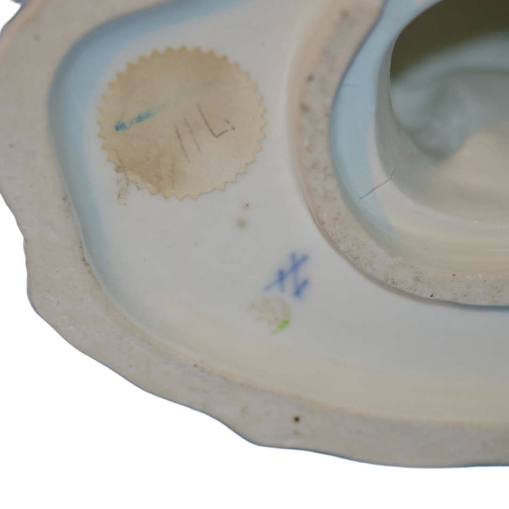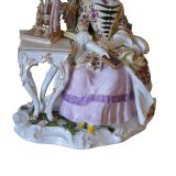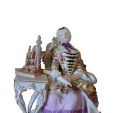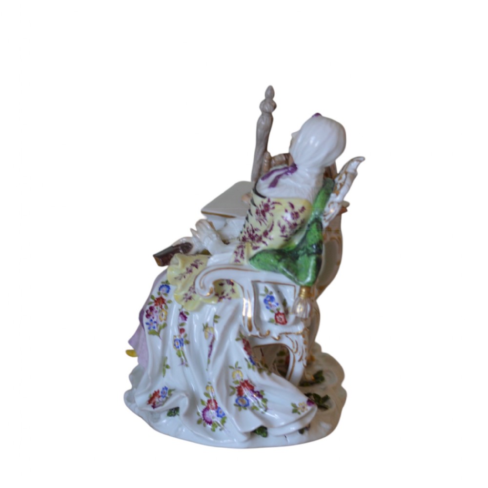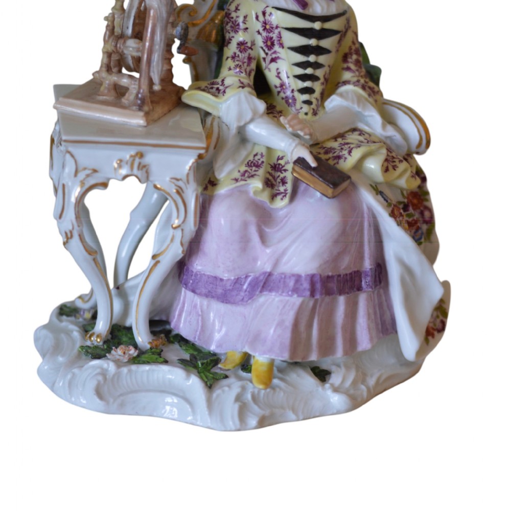 For offer is a most attractive 18th Century Meissen Porcelain Figure of a Lady seated beside a Spinning Wheel. She is reclining in a high-backed chair with a book in her right hand. The scrolled base is applied with flowers. Circa 1750 Blue crossed swords mark. Height: 16cm Width: 16 cm Depth: 11 cm Note. The model is after the engraving 'Les amusements de la vie privée' by Louis Surugue of 1747, after the painting by Chardin of 1746. The engraving was dedicated to Madame La Comtesse de Tessin. in very good condition with only some very minor restoration to the back of the chair. A high quality piece. The prices include delivery to a UK address. International deliveries are welcome, please contact for international postage costs. Internal Ref: 2426