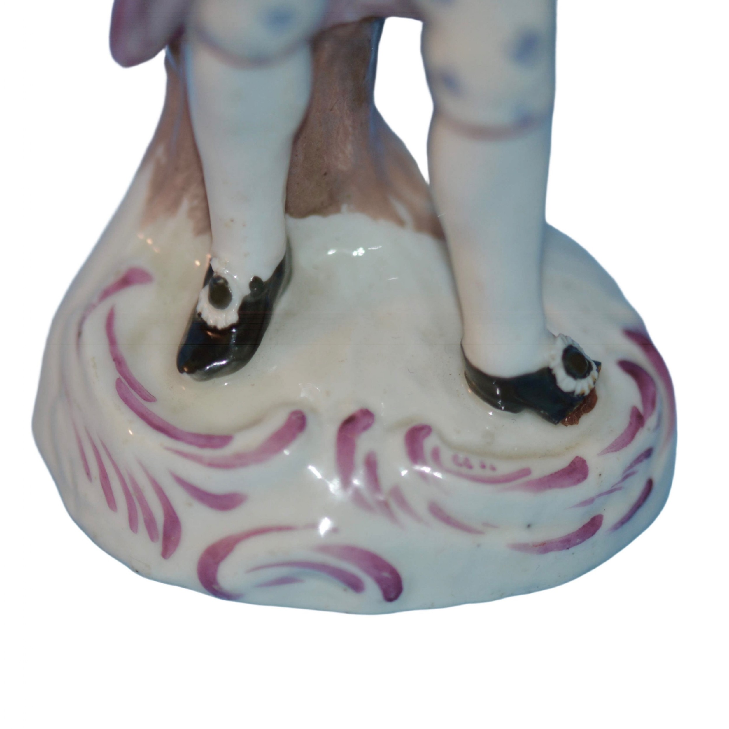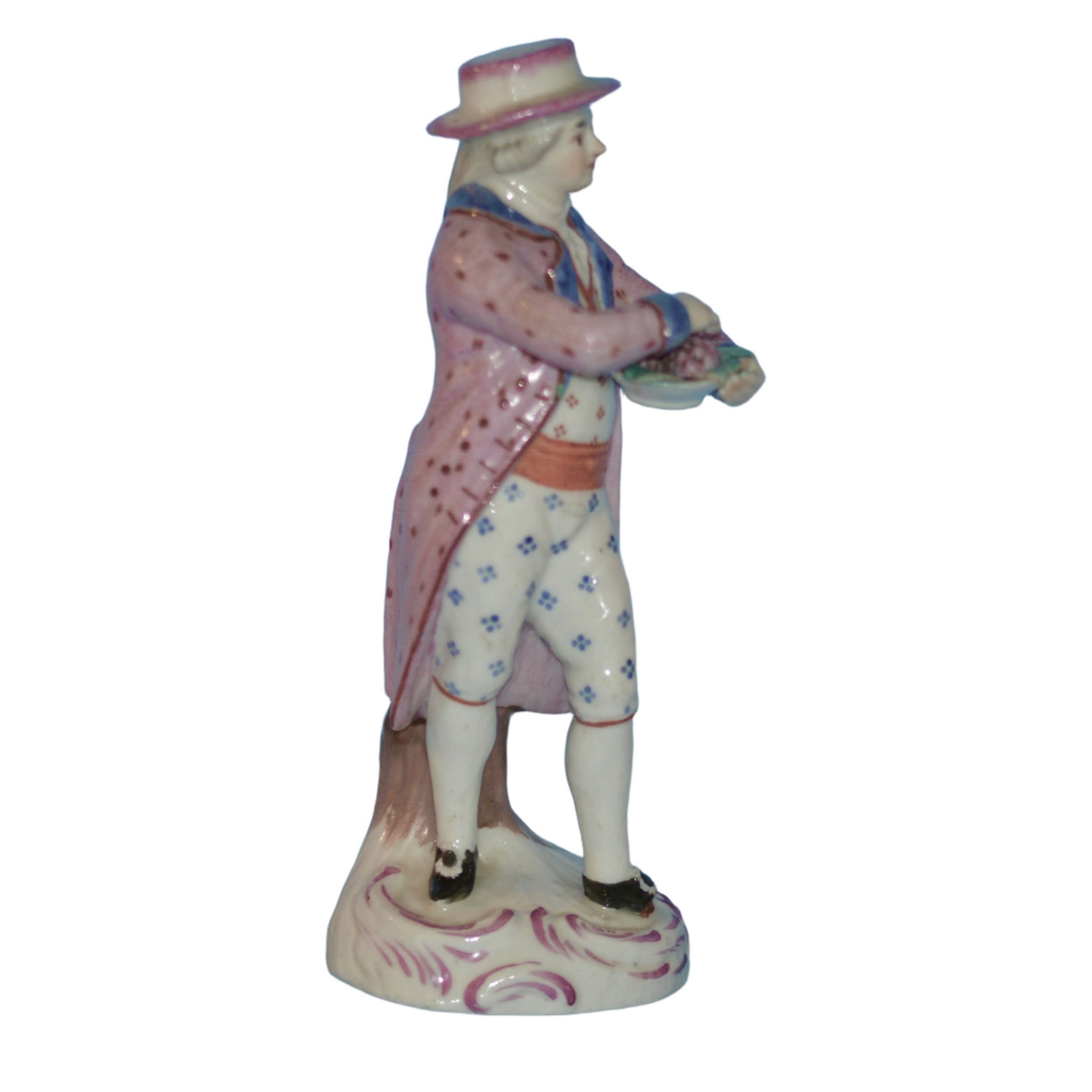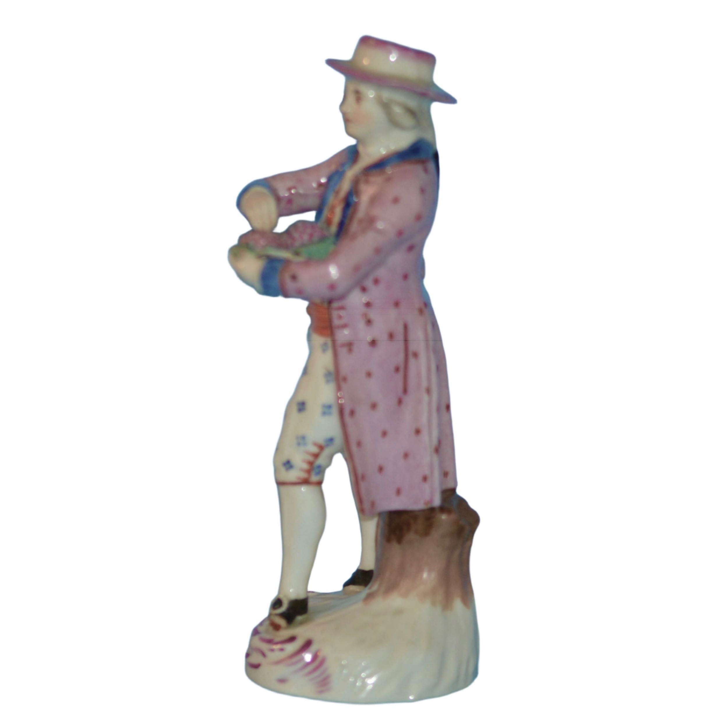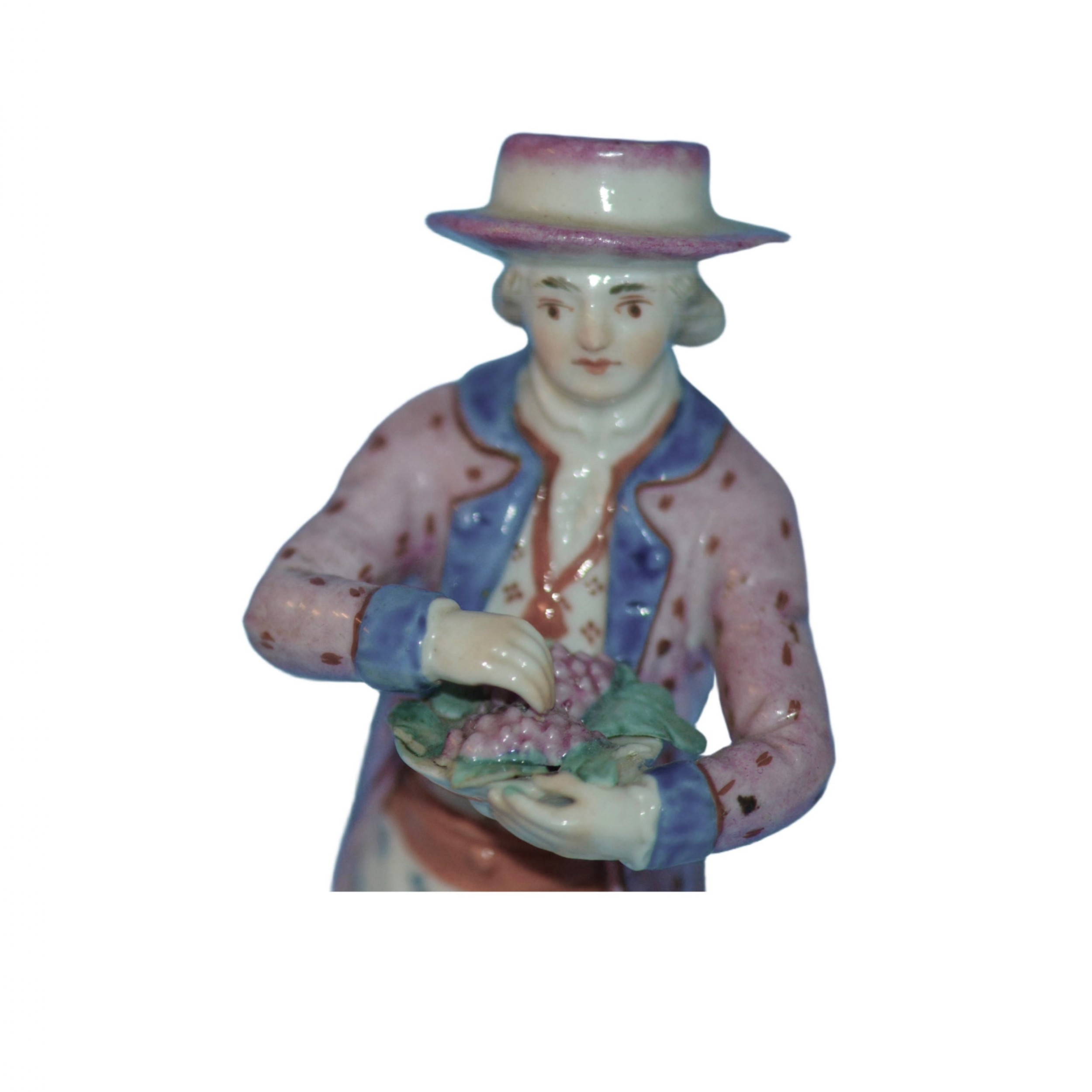 For offer is a rare porcelain figure of a Vintner produced by the German Limbach factory, often associated with the work of Gotthelf Greiner. c.1780 These figures are part of the genre of "hardworking peasants" or allegorical series popular in the 1770s-1780s The attractive figure is standing holding a plate of grapes typically beside a tree stump. The Limbach factory in Thuringia was known for producing less refined, more rustic, and colourful porcelain compared to Meissen, catering to a different market in the late 18th century. Height: 14 cm Width: 5 cm Condition. For an item nearly 250 years old the figure is generally in very good condition. The figure is lacking the tip of his left foot and there are some very minor losses to the grape foliage. Also a tiny 3 millimetre chip to the rim of his hat that is difficult to discern. No restoration. The prices include delivery to a UK address. International deliveries are welcome, please contact for international postage costs. Internal Ref: 2429