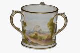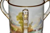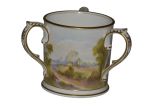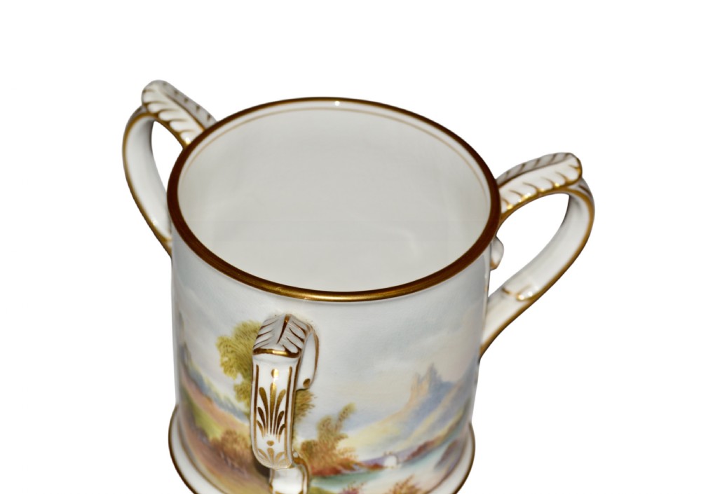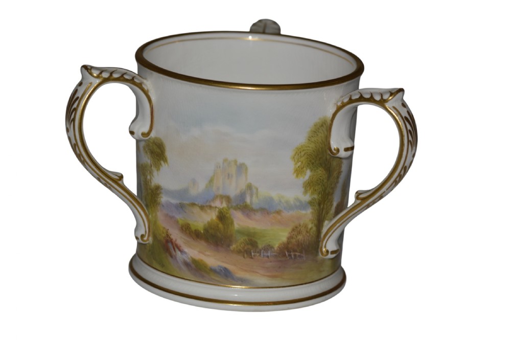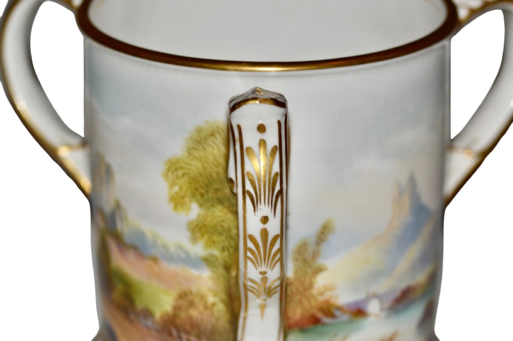 Offered for sale is this 1910 Royal Worcester porcelain Tyg. Painted with a landscape scene depicting cattle beside a lake and castles with a mountainous background, Signed ‘R Rushton’ Some crazing and minor wear commensurate with age and otherwise in very good order. The prices include delivery to a UK address. International deliveries are welcome, please contact for international postage costs. Internal Ref: 2301