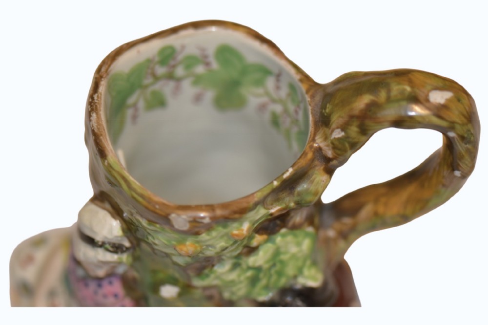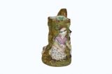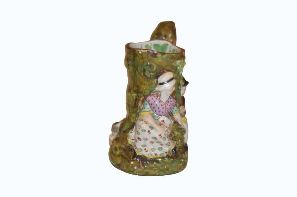 This is a very good quality early 18th Century Staffordshire pearlware 'Fair Hebe' jug. c 1710 Moulded with a man handing a woman a bird's nest, at the base of a tree trunk. The reverse with a sleeping hound. It is painted with overglaze enamels, and it has indistinct impressed number to base, perhaps 36. The jug is generally in good condition, for an item 300 years old, but there is a small rim chip, small surface chips beside the lady and to man's back. Minor paint loss. The prices include delivery to a UK address. International deliveries are welcome, please contact for international postage costs. Internal Ref: 1322