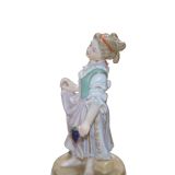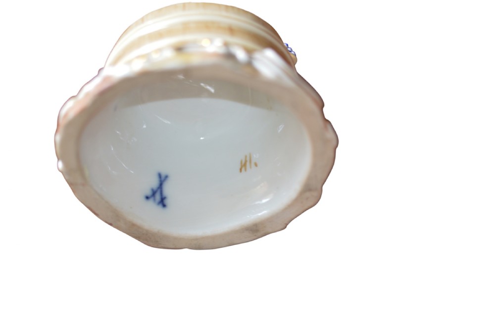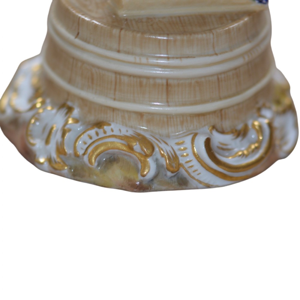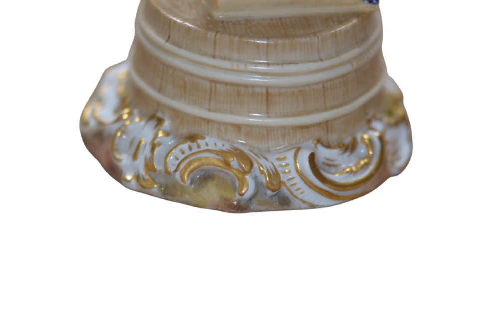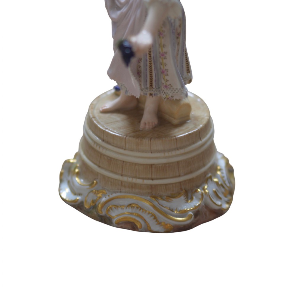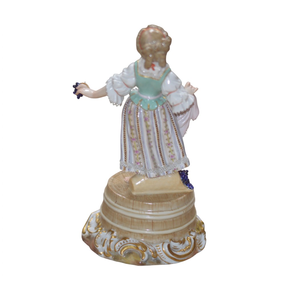 For offer is an outstanding Meissen porcelain figure of a girl holding grapes. Late 19th Century The girl is holding grapes in her left hand, with a hod with grapes at her feet. She is wearing a turquoise bodice, floral striped skirt and pale pink apron. She is standing on a pedestal in the shape of a barrel. The base is moulded with gilt scrollwork, Height: 14.5 cm Width: 7 cm Depth: 7 cm Crossed swords mark in underglaze-blue and incised model number N1 with gilt HI. In excellent condition The prices include delivery to a UK address. International deliveries are welcome, please contact for international postage costs. Internal Ref: 2430